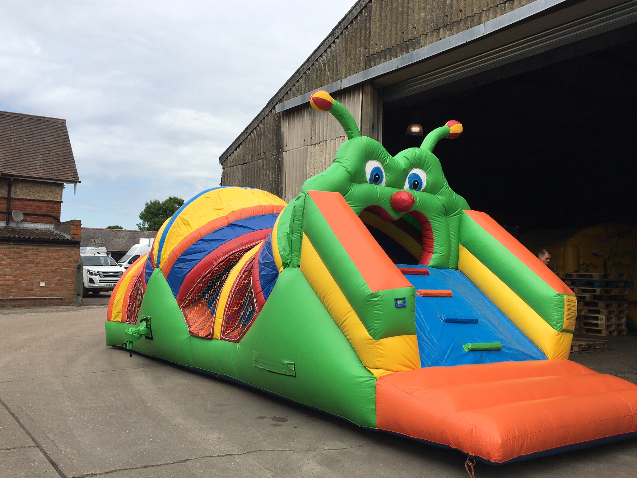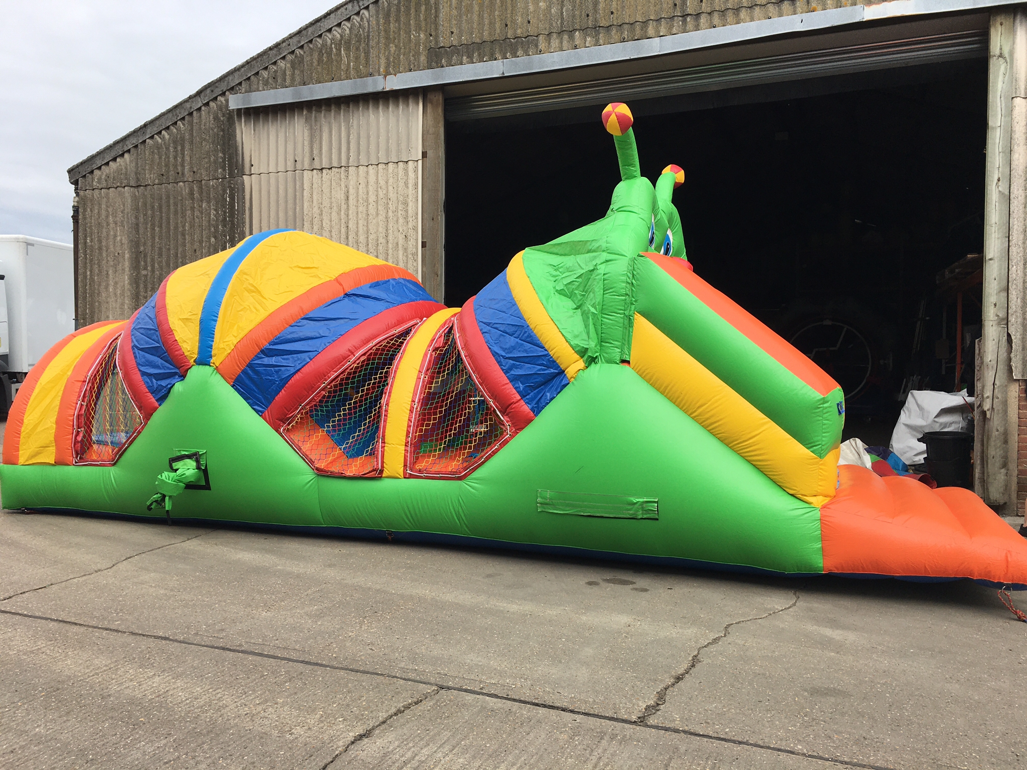 Caterpillar obstacle activity run, which is 10m long x 3m wide x 3m high. Children just love his brightly coloured artwork and welcoming persona. The children enter via his mouth with the easy climb steps provided. After sliding down a slide, you are then greeted with biff bash pop ups, before coming to a second up and over and exit slide. 13 amp power supply or petrol blower.