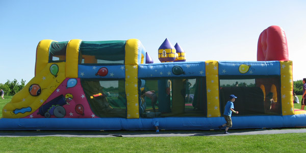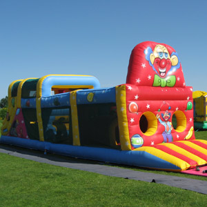 This very popular colourful inflatable is suitable for children from 3 to 12 years. Participants make their way by entering through a set of tubes, then a squeeze wall, under a rope net, through biff and bash, up a scramble net and finally down a large slope. Great fun and full of energy.