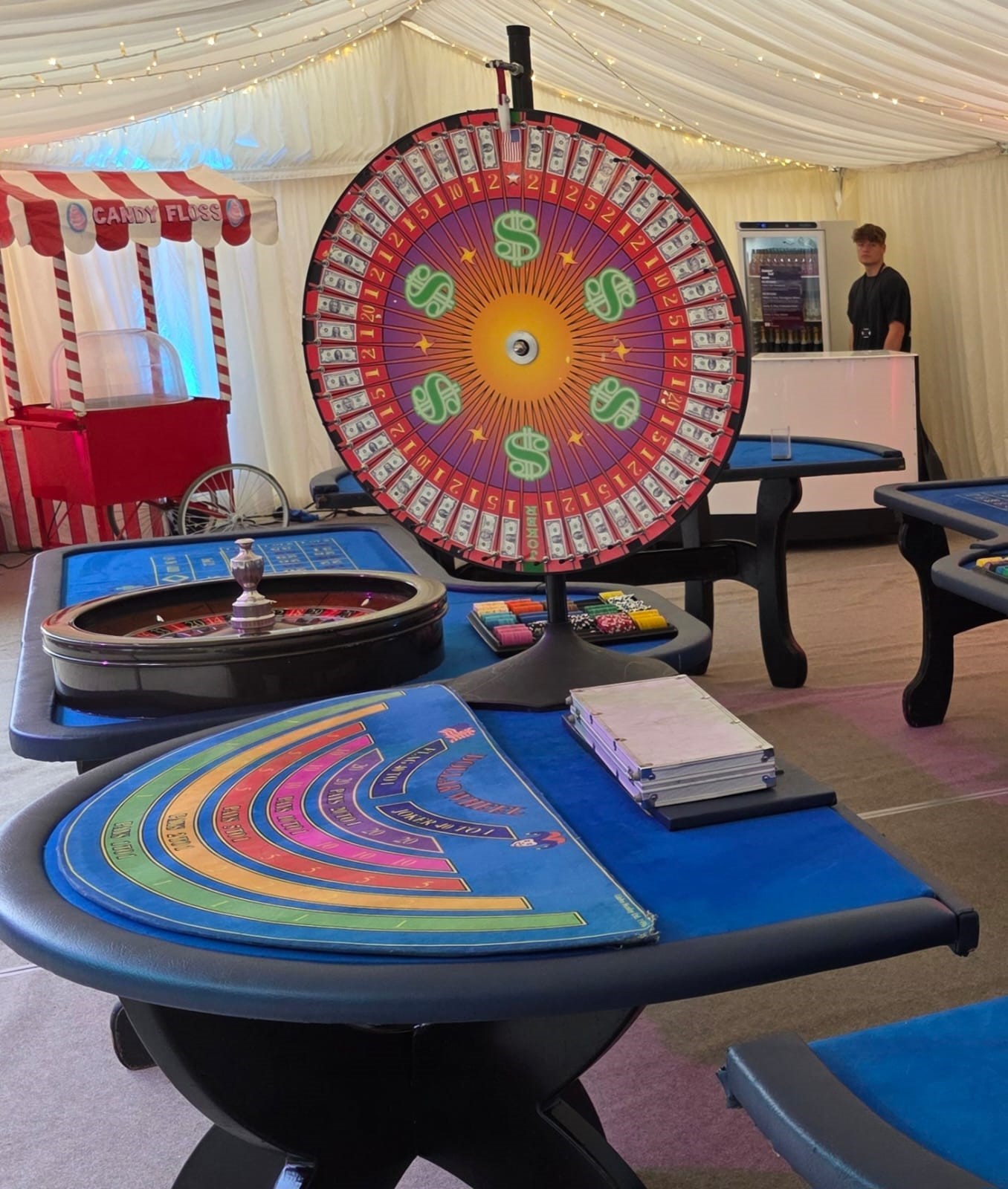 Roulette, Blackjack, Wheel of Fortune, Dice and Poker, with croupiers and fun money.