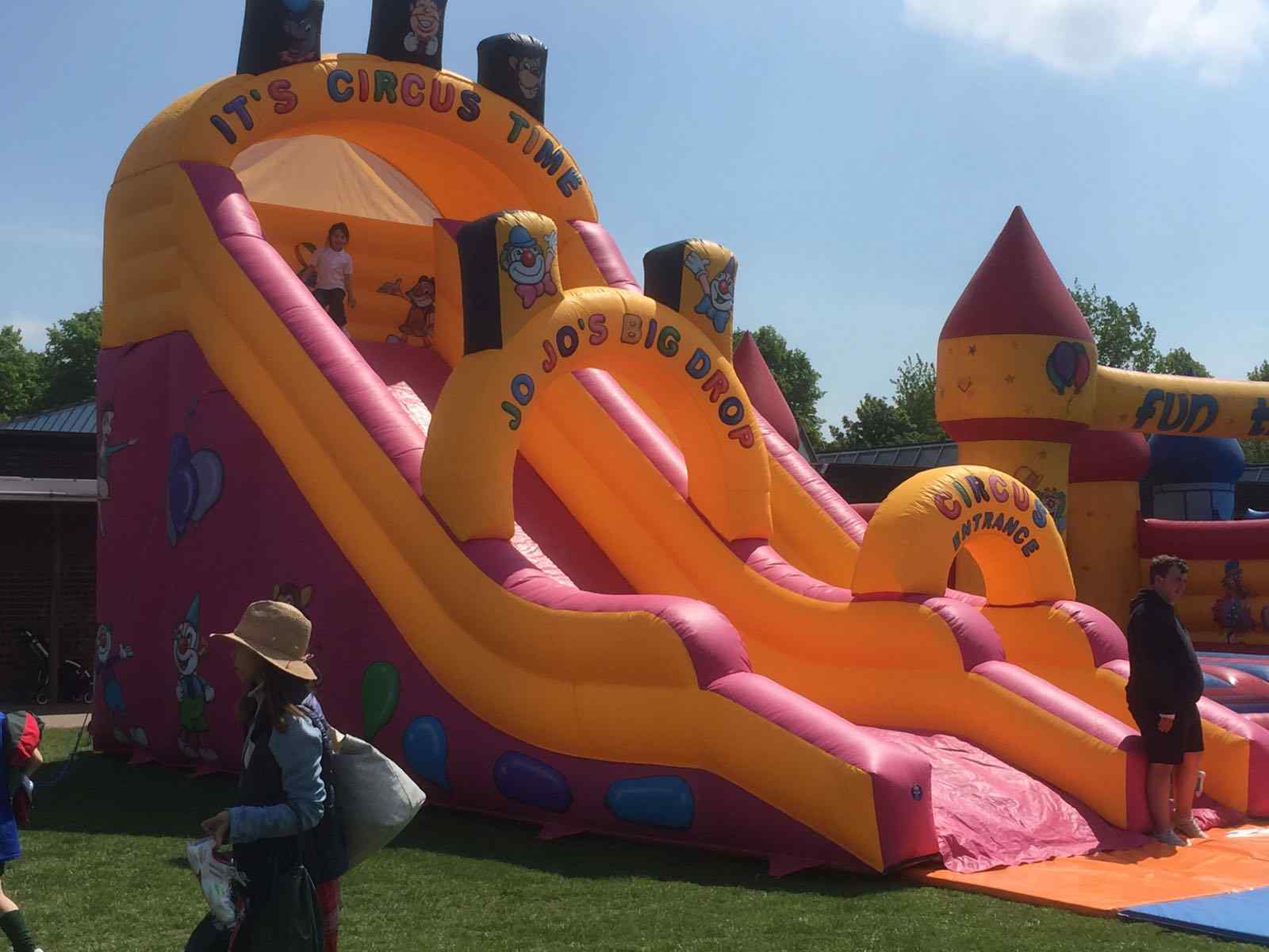 A bright and colourful mega slide, with circus themed artwork, ideal for family fun days and school events.