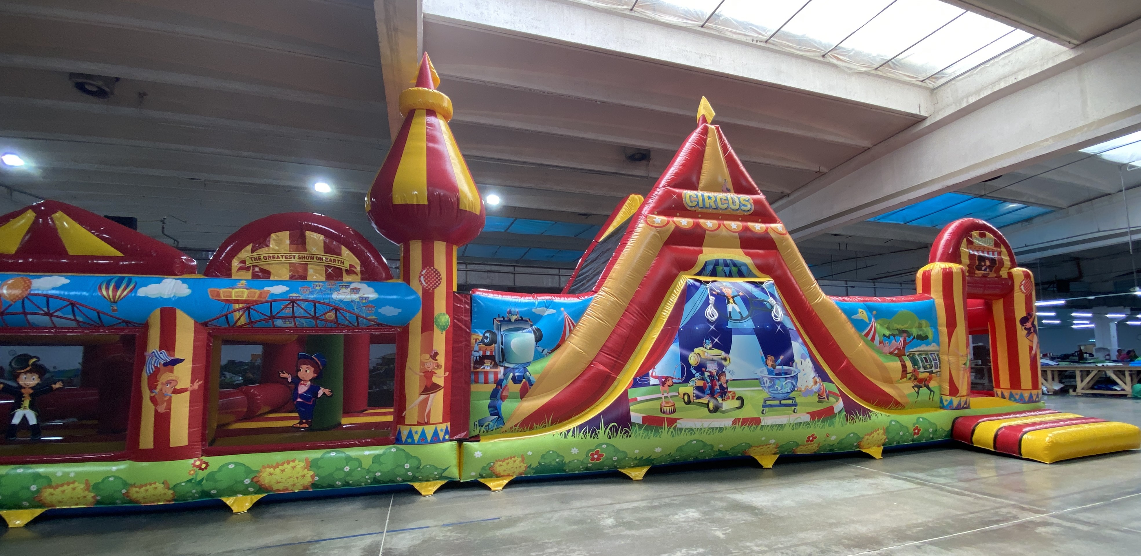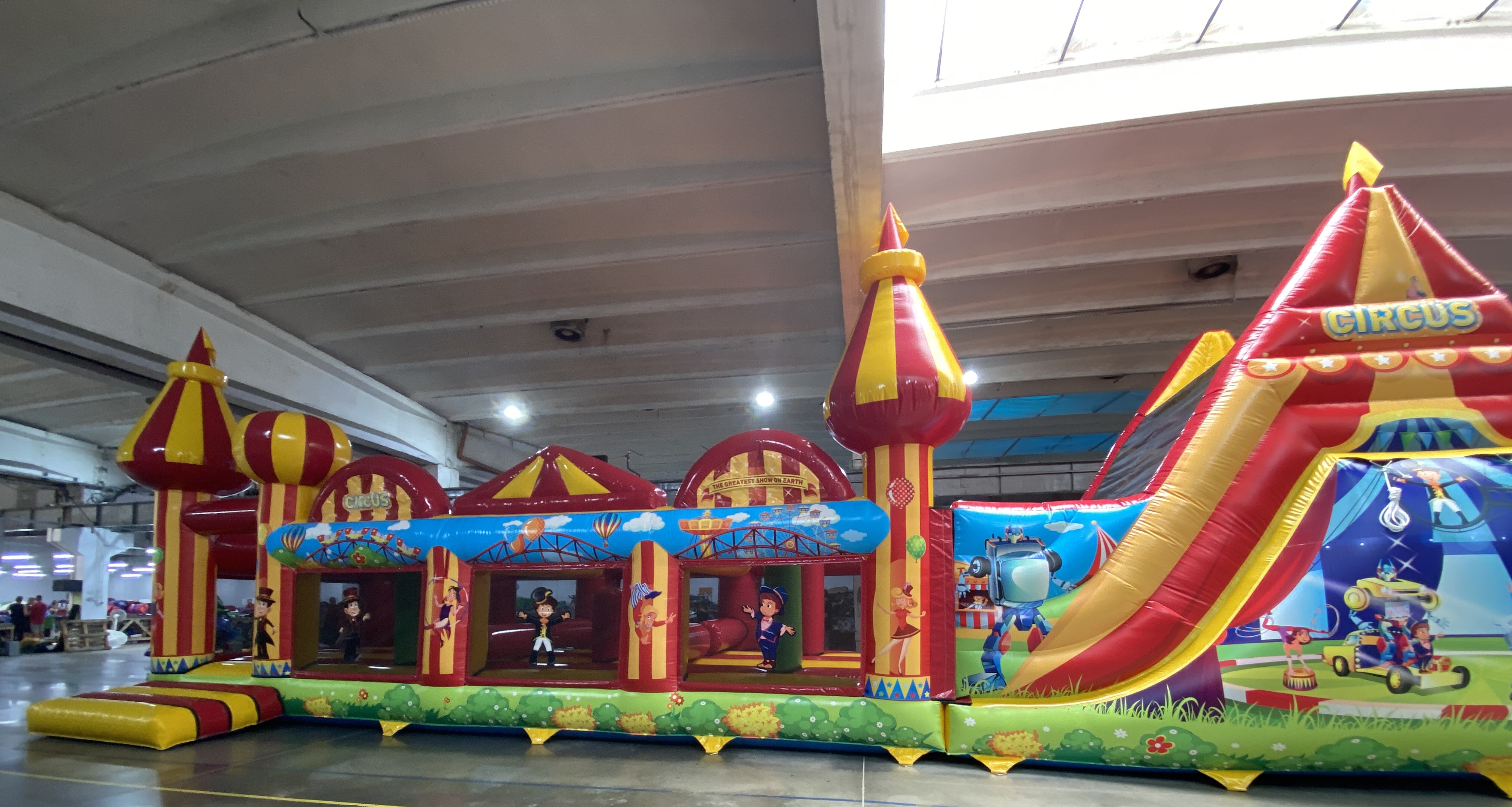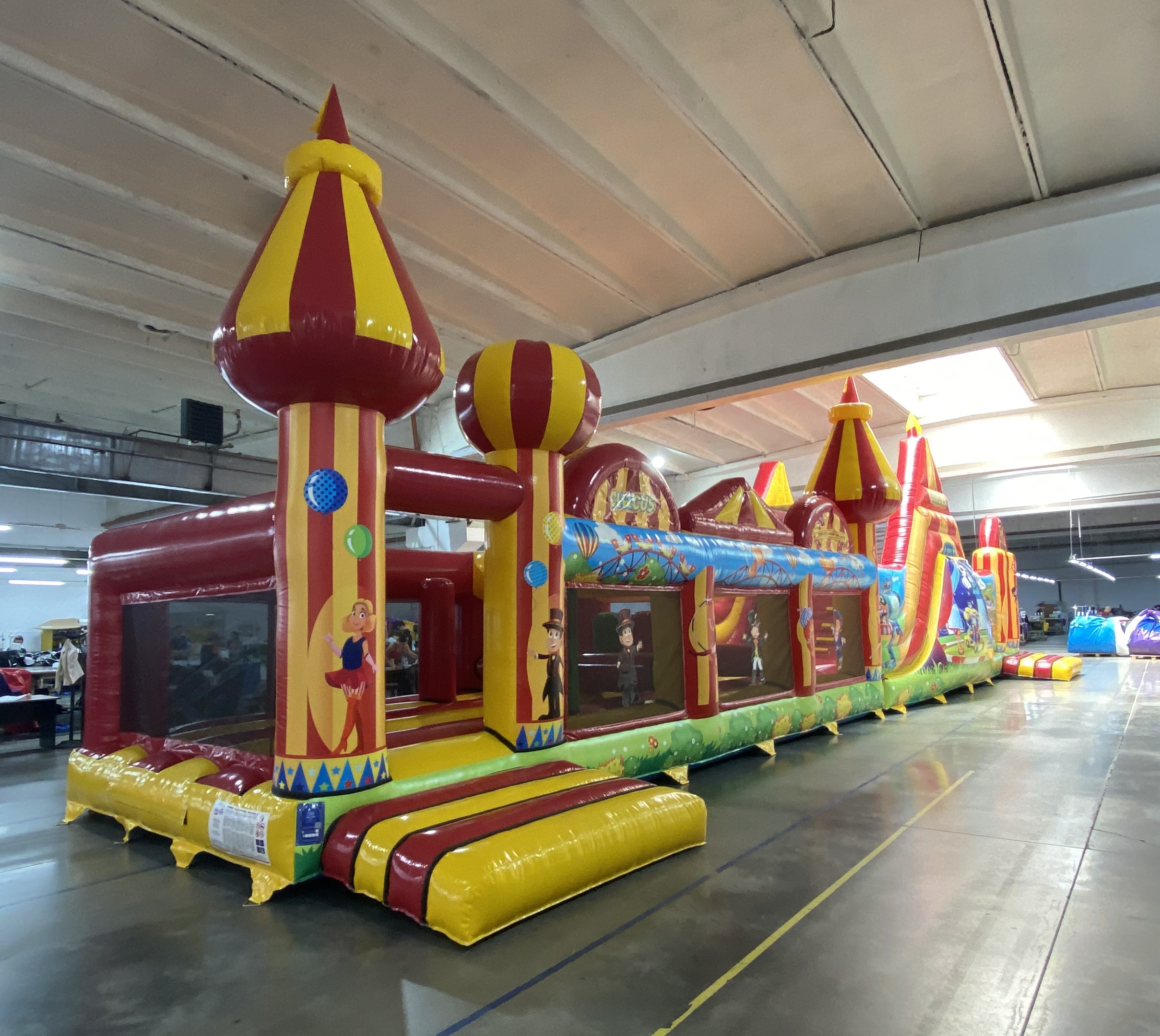 This is an impressive Circus themed fun run, incorporating biff and bash, plank walkway, squeeze rollers and more. This eye-catching inflatable measures a whopping 33 metres in length and has a slide via the exit, an amazing centre piece for your event. Suitable for children up to 12, with adults accompanying young children.