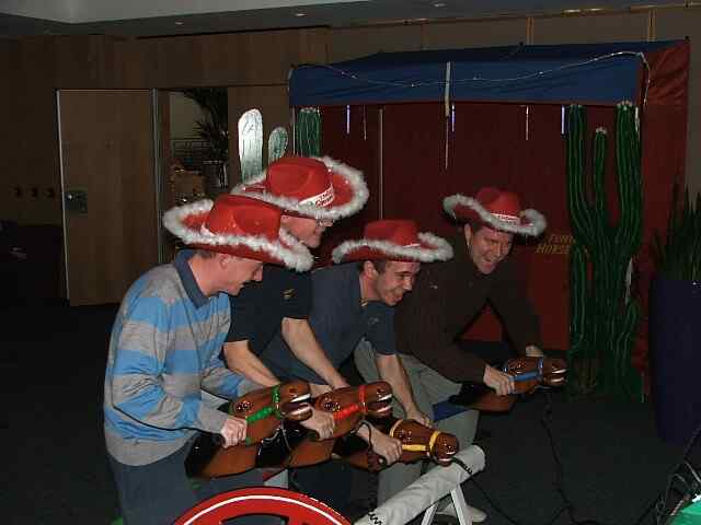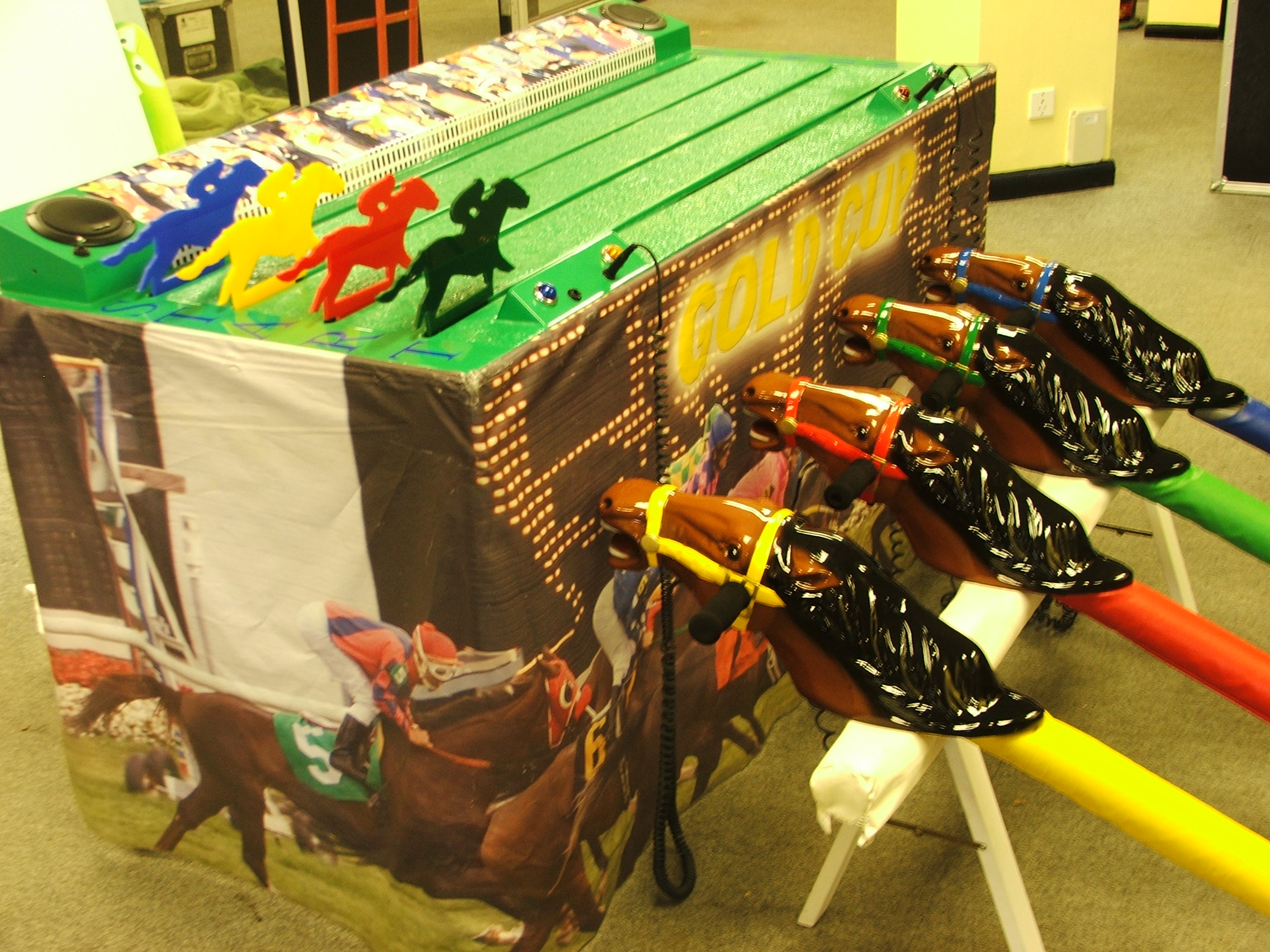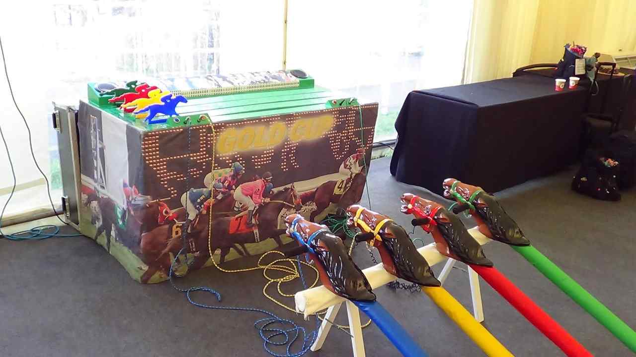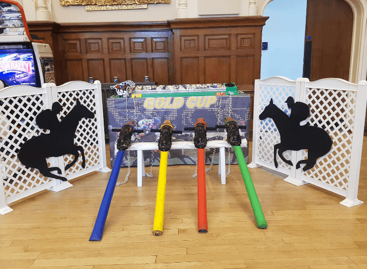 Four jockeys, with hobby horses between their legs, have to simulate a galloping motion – the faster you gallop the faster your horse goes. Players and spectators listen to the realistic racing commentary as the horses move along the track.