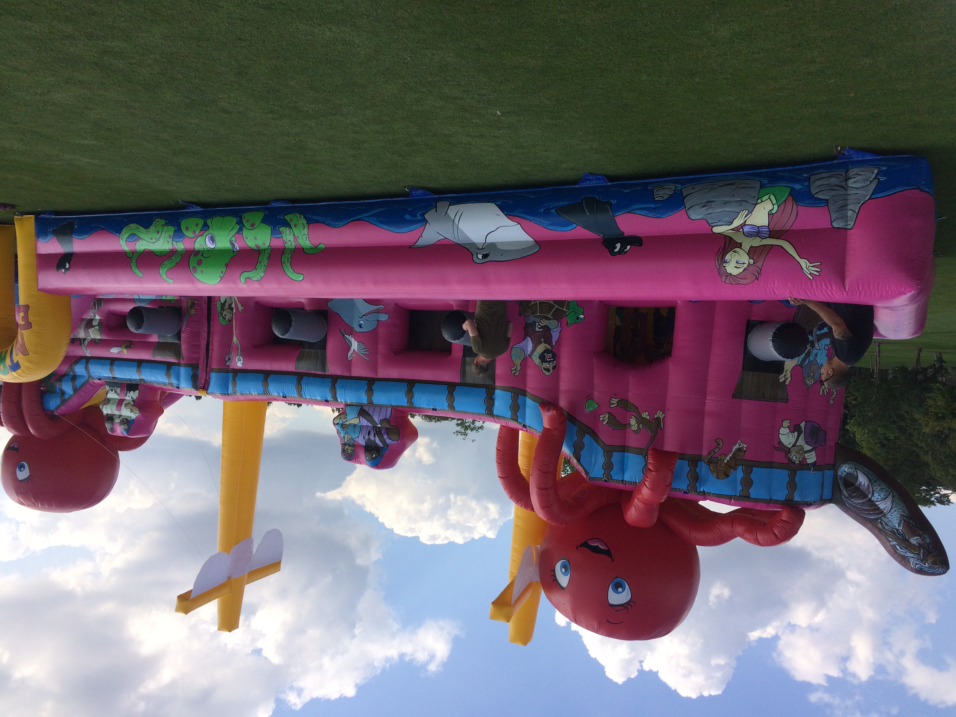 This inflatable pirate ship is a multi-activity run, incorporating biff an bash toys, squeeze rollers, large bouncy areas, a scramble net and a large slide.