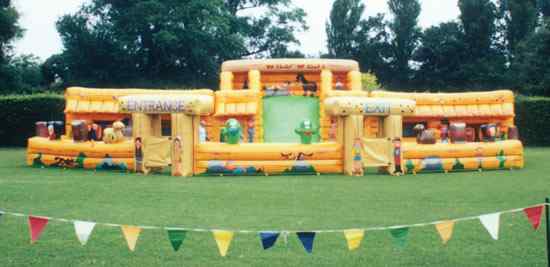 This certainly is an adventure with a western theme. There are two large inflatable playrooms, each with pop-up inflatables in them. Both rooms lead to a large slide which is in the centre. The whole unit is surrounded by an inflatable barrier for the children’s safety.