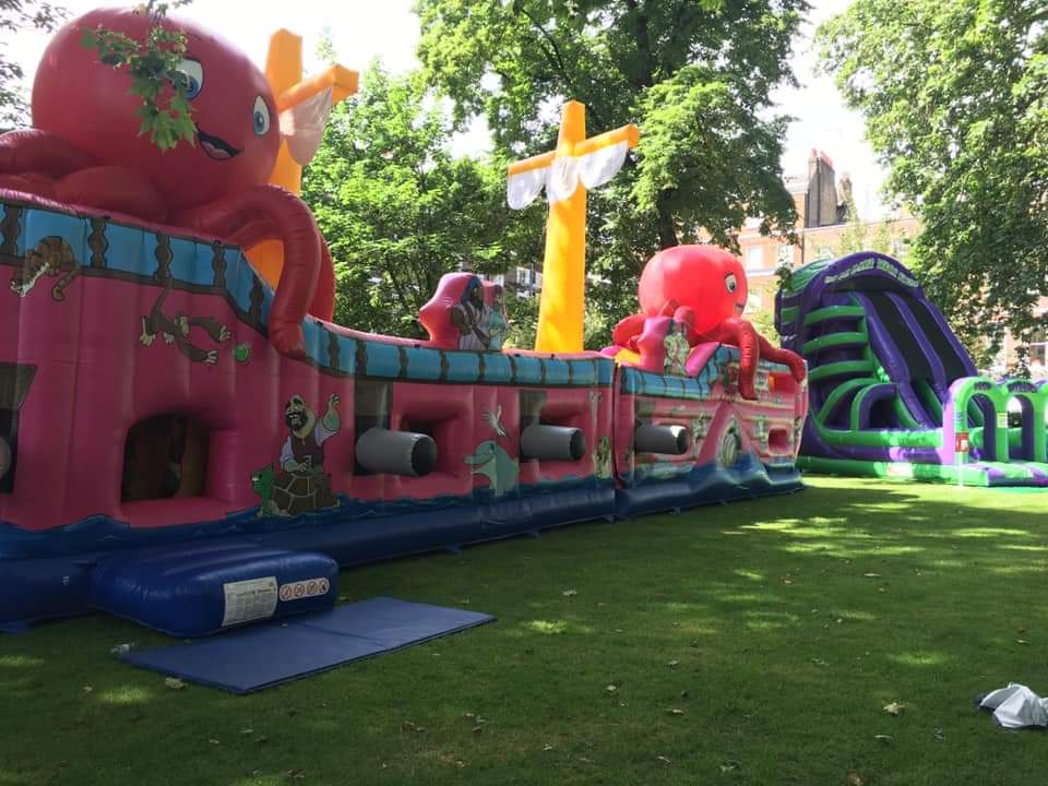 This inflatable pirate ship is a multi-activity run, incorporating biff an bash toys, squeeze rollers, large bouncy areas, a scramble net and a large slide, suitable form Children up to the age of 13 years and it will hold up to 20 children at a a time.