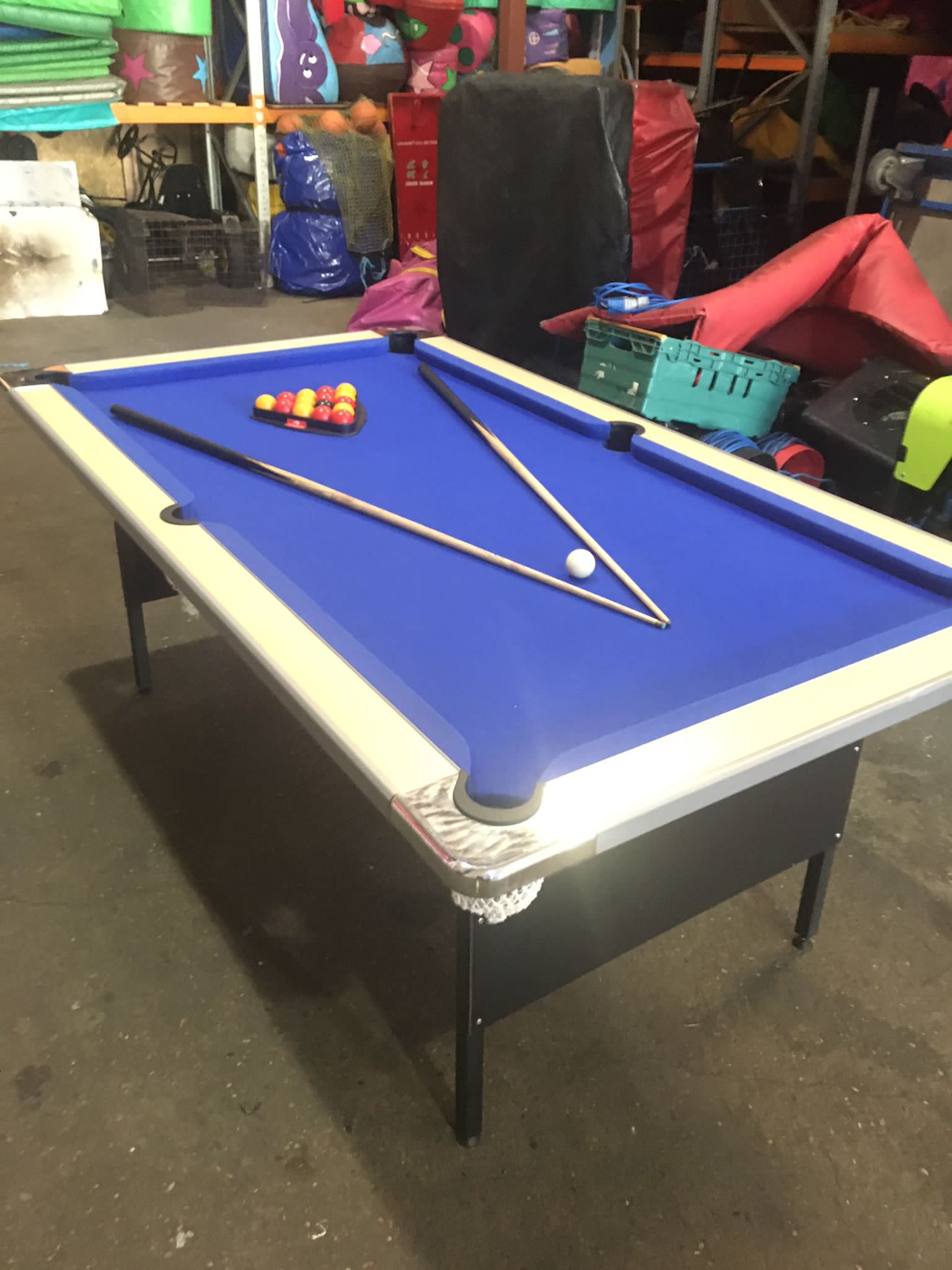 Our pool tables are just as you would find in pubs and clubs with a slate bed and full size cues and balls. The slate bed table measures 2m x 1.2m x 1.8m.