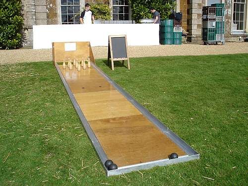 A good old, nine pin, bowling alley that is transportable. A popular game that was around long before tenpin bowling arrived on the scene. This measures 5m x 1m.