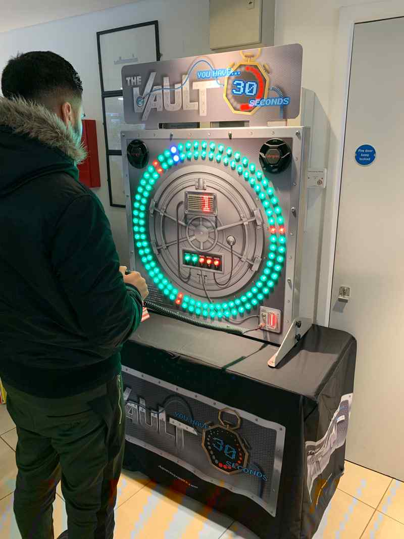 The Vault is an interactive game of reaction, requiring that the player attempts to stop the orbiting white light in the red 'locked' zone, Using the hand-held trigger, players try to stop the orbiting white light in a red 'locked' zone. You have 30 seconds to 'unlock' all 5 digits of the code and crack the Vault to win! An entertaining and fun addition to your event and suitable for all ages, The Vault has easily adjusted difficulty levels to accommodate all abilities! Why not also check out our other arcade games and challenges....