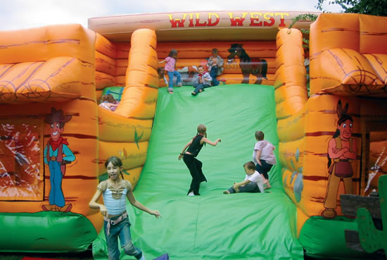 This certainly is an adventure with a western theme. There are two large inflatable playrooms, each with pop-up inflatables in them. Both rooms lead to a large slide which is in the centre. The whole unit is surrounded by an inflatable barrier for the children’s safety.